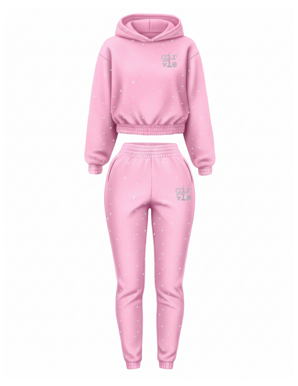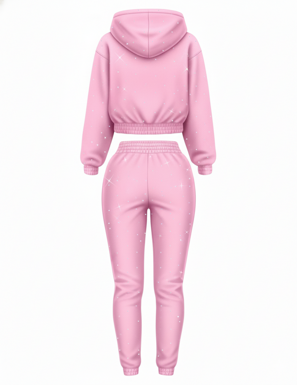 Premium cropped hoodie and joggers crafted from thick cotton-fleece, elevated with precision hand-placed high-quality rhinestones. Signature sparkle side stripes enhance movement and shape while maintaining a clean, modern silhouette. Designed to flatter the body with a soft, structured, everyday-wear fit.